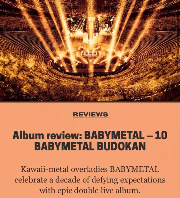 2021年9月23日1224375 まとめ BABYMETAL TIMES Kerrangの「10BABYMETAL BUDOKANライブアルバム」レビュー 0 0 0 Album Review ; 4/5 点#BABYMETAL #10BMY #BABYMETAL_BUDOKAN https;//t.co/5jrWwhfj8V pic.twitter.com/vuVyG9b2ou— けいたん🦊@Home/Fully Vaccinated. (@soulbicycle) September 23%2C 2021 続きを読む 続きを読む COMMENT スパム対策(このスペースには書き込まないでください) 残り文字数 0 RECOMMEND 来週の10.26(日)「EIGHT-JAM」にBABYMETALが出演 - べビメタだらけの・・・ 18時間前 コメント数:0 ブルワーズがドジャースに1対3で敗れ、CS3連敗 ブルワーズファンの反応 【海外の反応】 - BABYMETALIZE 3日前 コメント数:0 チャンピオンシップシリーズでブルワーズがドジャースに連敗 ブルワーズファンの反応 【海外の反応】 - BABYMETALIZE 5日前 コメント数:0 ブルワーズがドジャースにスウィープされて敗退決定 ブルワーズファンの反応 【海外の反応】 - BABYMETALIZE 1日前 コメント数:0 JAM Project x BABYMETALのワンパンマンのオープニングソングが公開 【海外の反応】 - BABYMETALIZE 5日前 コメント数:0 Su-METALの歯の矯正は、彼女のボーカルを変化させたのか 【海外の反応】 - BABYMETALIZE 2日前 コメント数:0