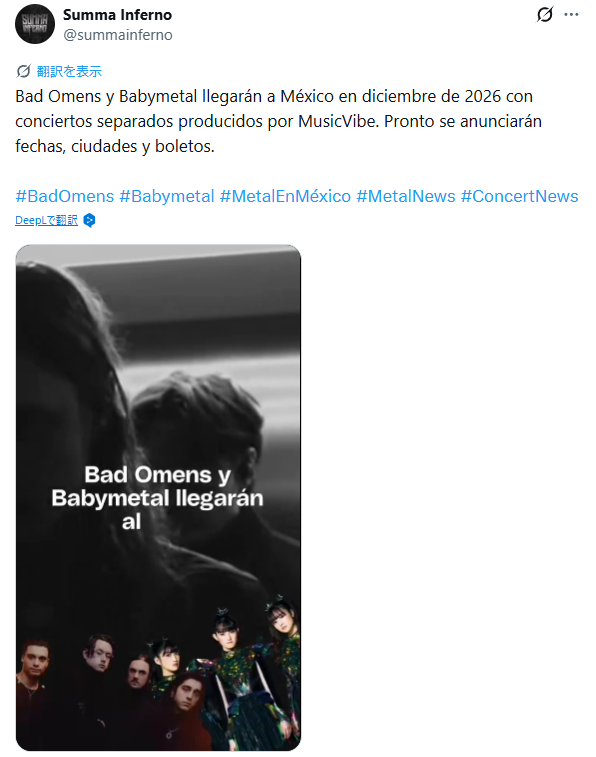 3時間前1243402 まとめ べビメタだらけの・・・ 【海外】Summa Infero:BABYMETALが2026年12月にメキシコに戻ってくる 0 0 0 Bad Omens y Babymetal llegarán a México en diciembre de 2026 con conciertos separados producidos por MusicVibe... 続きを読む COMMENT スパム対策(このスペースには書き込まないでください) 残り文字数 0 RECOMMEND 川﨑宗則のカナダに向けたメッセージビデオ “日本の外務省の公式ってのが最高だ” 【海外の反応】 - BABYMETALIZE 6日前 コメント数:0 かすかなはな / キタニタツヤ feat. BABYMETALのミュージックビデオが公開 【海外の反応】 - BABYMETALIZE 2日前 コメント数:0 【海外】Summa Infero:BABYMETALが2026年12月にメキシコに戻ってくる - べビメタだらけの・・・ 3時間前 コメント数:0 BABYMETALと他の日本人アーティストの国内と海外のYOUTUBE視聴数の乖離 【海外の反応】 - BABYMETALIZE 6日前 コメント数:0 「BABYMETALのメタラジ!」ラスト3回のゲスト予想 - べビメタだらけの・・・ 4日前 コメント数:0 今度のBABYMETALのツアーで、MOAMETALの生のボーカルを聴けるのかな? 【海外の反応】 - BABYMETALIZE 3日前 コメント数:0