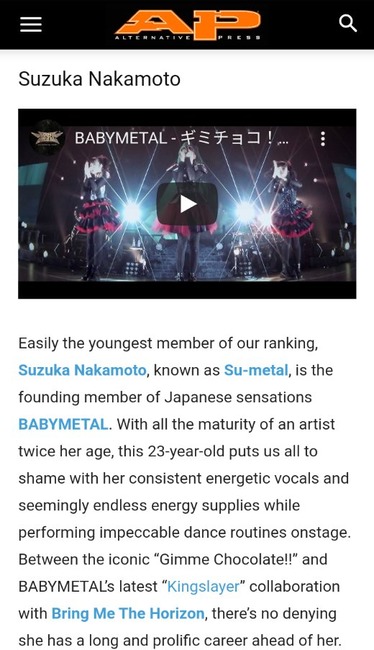 メタル界を牽引する女性ヴォーカリスト20人にSU-METAL