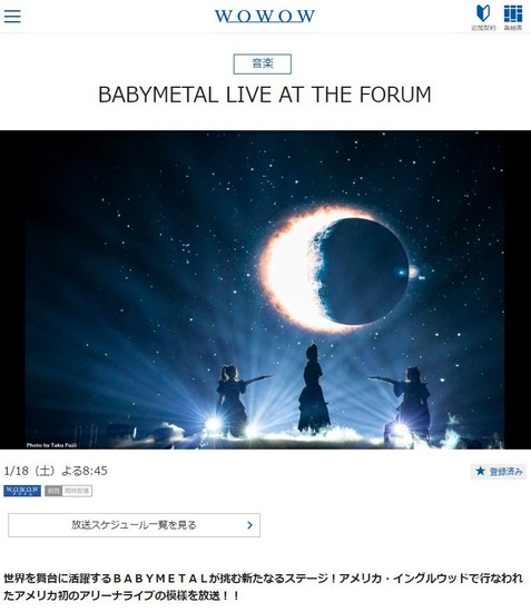 来年1月に「BABYMETAL Live At The Forum!」WOWOWにて放送決定