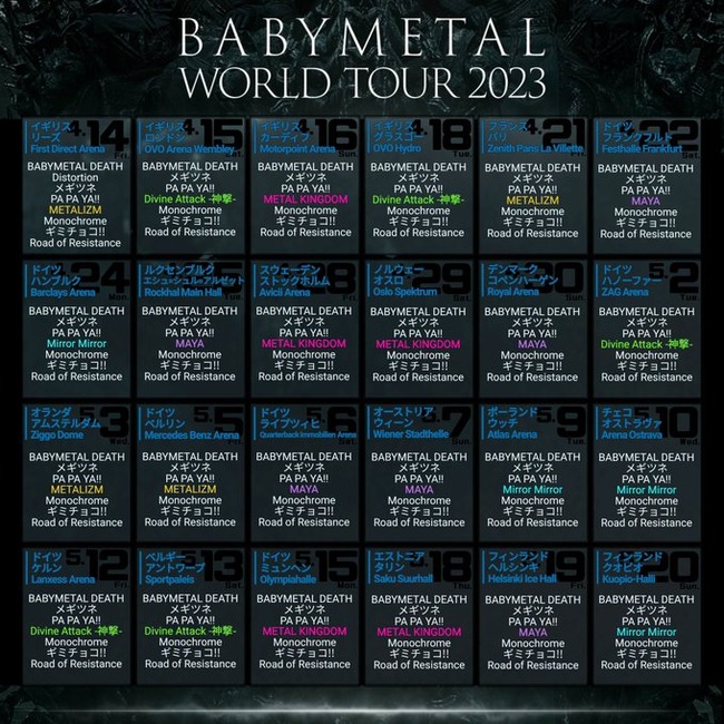 BABYMETAL TIMES 全9541件取得 21/319 前の30件 次の30件 2023年5月27日1232876 まとめ BABYMETAL TIMES BABYMETAL・台北公演が映画館で生中継&ディレイ・ビューイング決定!! 0 0 0 2023年5月26日1232856 まとめ BABYMETAL TIMES 「BABYMETAL WORLD TOUR 2023 ASIA」ジャカルタ公演のハイライト 0 0 0 2023年5月26日1232853 まとめ BABYMETAL TIMES BABYMETAL公式「Thank you for coming to "BABYMETAL WORLD TOUR 2023 in Jakarta" 」 0 0 0 2023年5月26日1232844 まとめ BABYMETAL TIMES 「BABYMETAL WORLD TOUR 2023 ASIA」ジャカルタ公演のセトリとファンカム 0 0 0 2023年5月25日1232841 まとめ BABYMETAL TIMES 堀内まり菜さん・佐藤日向さんが「リーディングドラマ ロミオとジュリエット」に出演 0 0 0 2023年5月25日1232836 まとめ BABYMETAL TIMES 「BABYMETAL WORLD TOUR 2023 ASIA」ジャカルタ公演直前 0 0 0 2023年5月25日1232835 まとめ BABYMETAL TIMES 世を忍ぶ仮の姿のべビメタちゃんが目撃される 0 0 0 2023年5月25日1232828 まとめ BABYMETAL TIMES METALVERSEへの入口 0 0 0 2023年5月24日1232826 まとめ BABYMETAL TIMES 「KOIAI」国内初ライブのゲストダンサーに平井 沙弥さん 0 0 0 2023年5月24日1232823 まとめ BABYMETAL TIMES @onefive『TOKYO IDOL FESTIVAL 2023』に出演決定!&ミニライブの模様 0 0 0 2023年5月24日1232822 まとめ BABYMETAL TIMES 「BABYMETAL WORLD TOUR 2023」のジャカルタ公演のグッズ 0 0 0 2023年5月24日1232816 まとめ BABYMETAL TIMES BABYMETAL「THE BABYKLOK TOUR 2023」 LA公演の追加開催決定!! 0 1 0 2023年5月23日1232813 まとめ BABYMETAL TIMES @onefive ・メジャー初シングル「Chance×Change」発売!! 1 0 0 2023年5月23日1232809 まとめ BABYMETAL TIMES すぅさんが履いてるブーツのブランドが判明? 0 0 0 2023年5月23日1232804 まとめ BABYMETAL TIMES 新生BABYMETALの三人それぞれの初ソロ写真 0 0 0 2023年5月22日1232800 まとめ BABYMETAL TIMES BABYMETAL、SABATON、Lordiとのズッ友キタ━‼ 0 0 0 2023年5月22日1232797 まとめ BABYMETAL TIMES BABYMETALディレイビューイング「BLACK NIGHT」の感想 0 0 0 2023年5月22日1232792 まとめ BABYMETAL TIMES ベビメタのオーストラリア公演を「RELIQA」というバンドがサポート 0 0 0 2023年5月21日1232790 まとめ BABYMETAL TIMES 新生BABYMETALが召喚され、新たな展開へ…再び世界を目指せるか 0 0 0 2023年5月21日1232788 まとめ BABYMETAL TIMES BABYMETAL、サバトン帯同ツアーの全セトリまとめ 0 0 0 2023年5月21日1232782 まとめ BABYMETAL TIMES BABYMETALマレーシア誌の独占インタビュー 0 0 0 2023年5月21日1232781 まとめ BABYMETAL TIMES BABYMETAL、サバトン帯同ツアー「Kuopio」公演 セットリストとファンカム 0 0 0 2023年5月20日1232776 まとめ BABYMETAL TIMES BABYMETAL、"WORLD TOUR 2023"台北公演を全国の映画館にて生中継決定! 0 0 0 2023年5月20日1232767 まとめ BABYMETAL TIMES 6.14 リリース記念「BABYMETAL RETURNS - THEOTHERONE - LIVESHIP」プレミア配信開催!! 0 0 0 2023年5月20日1232760 まとめ BABYMETAL TIMES BABYMETAL、サバトン帯同ツアー「Helsinki」公演 セットリストとファンカム 0 0 0 2023年5月19日1232755 まとめ BABYMETAL TIMES @onefiveのファンがメンバーにインタビュー! 0 0 0 2023年5月19日1232751 まとめ BABYMETAL TIMES BABYMETAL、サバトン帯同ツアー「Tallinn」公演 セットリストとファンカム 0 0 0 2023年5月19日1232739 まとめ BABYMETAL TIMES BABYMETALが大好きなちびっ子メタル 0 0 0 2023年5月18日1232733 まとめ BABYMETAL TIMES 岡山の地元高校生が「推し武道」コラボ商品開発やイベント実施へ 0 0 0 2023年5月18日1232730 まとめ BABYMETAL TIMES 荒ぶるもあちゃんがよろけてしまう 0 1 0 ホーム BABYMETAL TIMES 全9541件 前の30件 次の30件
