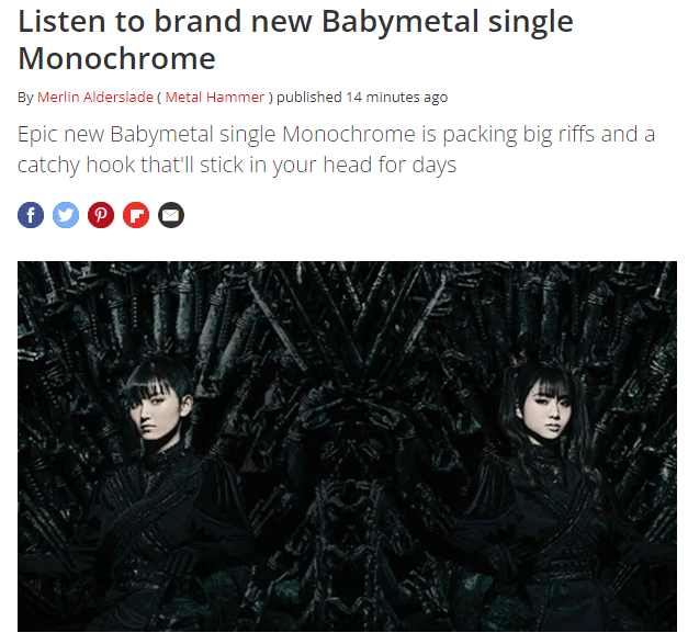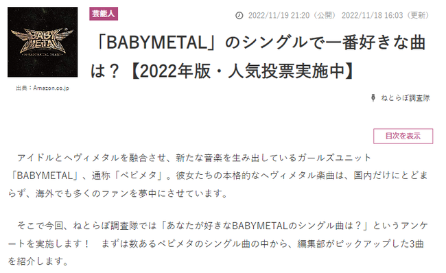BABYMETAL TIMES 全9541件取得 43/319 前の30件 次の30件 2022年11月27日1229426 まとめ BABYMETAL TIMES BABYMETALの幕張はピットは当選祭り、シートは落選祭り 0 0 0 2022年11月27日1229423 まとめ BABYMETAL TIMES アミューズ・大里会長インタビュー 0 0 0 2022年11月26日1229420 まとめ BABYMETAL TIMES 新谷ゆづみさん出演ドラマ『異世界居酒屋「のぶ」』が帰ってくるぅ~ 0 0 0 2022年11月26日1229418 まとめ BABYMETAL TIMES BABYMETAL「Divine Attack – 神撃」のカラオケが早くも登場 0 0 0 2022年11月26日1229411 まとめ BABYMETAL TIMES BABYMETALのライブで世界初の「サイレントモッシュピット」エリアが設置 0 0 0 2022年11月25日1229406 まとめ BABYMETAL TIMES 田口華さん出演「放課後戦記2022」のVRライブ配信が決定 &ツインテール披露 0 0 0 2022年11月25日1229397 まとめ BABYMETAL TIMES BABYMETALの幕張メッセ 国際展示場公演で「Savior Mask」配布 0 0 0 2022年11月25日1229389 まとめ BABYMETAL TIMES 現代メタルガイドブックの「注目すべき10アーティスト」にBABYMETAL 0 0 0 2022年11月24日1229387 まとめ BABYMETAL TIMES @onefive・SOYOさんの身長 0 0 0 2022年11月24日1229384 まとめ BABYMETAL TIMES BABYMETAL公式Spotifyで「Monochrome」のオリジナルCanvas搭載 0 0 0 2022年11月24日1229377 まとめ BABYMETAL TIMES 有名リアクターのへッ爺さんが久し振りにBABYMETALをリアクト(動画) 0 0 0 2022年11月23日1229373 まとめ BABYMETAL TIMES 島ゆいかさんのインスタストーリーズの日髙麻鈴さんが登場 0 0 0 2022年11月23日1229372 まとめ BABYMETAL TIMES 森ハヤシ・八木美樹さん出演「キラキラしてないわたしたちへ」ショートムービー公開 0 0 0 2022年11月23日1229365 まとめ BABYMETAL TIMES BABYMETALの「Monochrome」楽器カバー(動画) 0 0 0 2022年11月22日1229361 まとめ BABYMETAL TIMES 新潟市にある中華居酒屋がBABYMETALの聖地化してる 0 0 0 2022年11月22日1229354 まとめ BABYMETAL TIMES BABYMETALのリリックビデオに出て来る少女は誰? 0 0 0 2022年11月21日1229351 まとめ BABYMETAL TIMES さくら学院卒業生の田中美空・大賀咲希さんがインスタライブの感想 0 0 0 2022年11月21日1229348 まとめ BABYMETAL TIMES ケラング!チャート; 今週の最高の新曲 1位BABYMETAL「Monochrome」 0 0 0 2022年11月21日1229339 まとめ BABYMETAL TIMES BABYMETALの「Monochrome」のYouTube再生回数 0 0 0 2022年11月20日1229335 まとめ BABYMETAL TIMES 21時〜さくら学院卒業生の田中美空・大賀咲希さんがインスタライブ 0 0 0 2022年11月20日1229334 まとめ BABYMETAL TIMES BABYMETALの「神撃」と「Monochrome」はセルフオマージュ!? 0 0 0 2022年11月20日1229327 まとめ BABYMETAL TIMES 倉島颯良さんのインタビュー&初日舞台挨拶映像 0 0 0 2022年11月20日1229324 まとめ BABYMETAL TIMES 「BABYMETAL」のシングルで一番好きな曲は?人気投票実施中 0 0 0 2022年11月19日1229321 まとめ BABYMETAL TIMES 佐藤愛桜さんの無限リピートできる動画 0 0 0 2022年11月19日1229318 まとめ BABYMETAL TIMES 海外メディアが続々と「BABYMETAL、ニューシングルMonochromeをリリース」 0 0 0 2022年11月19日1229313 まとめ BABYMETAL TIMES BABYMETALの新曲「Monochrome」のリアクト動画が続々アップされてる 0 0 0 2022年11月18日1229311 まとめ BABYMETAL TIMES ノルウェー・元ABBATHのキングさん『ベビメタの曲で好きなのは「Monochrome」』 0 0 0 2022年11月18日1229310 まとめ BABYMETAL TIMES ゆよゆっぺさん「 作曲、編曲させていただきました」 0 0 0 2022年11月18日1229300 まとめ BABYMETAL TIMES デザイナー・Shimonさん「BABYMETAL初のリリックビデオを制作しました。」 0 0 0 2022年11月18日1229279 まとめ BABYMETAL TIMES 新曲「Monochrome」は今までに無いBABYMETAL? 0 0 0 ホーム BABYMETAL TIMES 全9541件 前の30件 次の30件