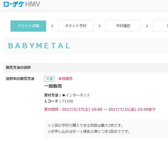 BABYMETAL5大キツネ祭りチケット一般 ローチケ鯖が大健闘するが2分で完売