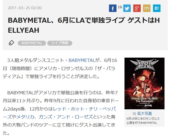 BABYMETALのLAワンマンライブ発表