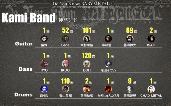 BABYMETALの神バンド降臨回数 大神101回、小神89回 BOH神120回 青山神110回 チャドメタル1回