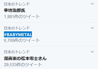BABYmatoMETAL 全10340件取得 102/345 前の30件 次の30件 2019年11月17日1210455 まとめ BABYmatoMETAL BABYMETAL METAL GALAXY SAITAMA SUPER ARENA 2日目セトリ 0 0 0 2019年11月17日1210449 まとめ BABYmatoMETAL BABYMETAL「Bring Me The Horizonとズッ友写真」 0 0 0 2019年11月17日1210447 まとめ BABYmatoMETAL BABYMETAL「スマホライトはご遠慮ください」 0 0 0 2019年11月17日1210438 まとめ BABYmatoMETAL BABYMETAL「METAL GALAXY TOUR SSA 2日目 物販」 0 0 0 2019年11月17日1210428 まとめ BABYmatoMETAL BABYMETAL「50RT以上の人気ベビメタツイート集」 0 0 0 2019年11月16日1210424 まとめ BABYmatoMETAL BABYMETAL「METAL GALAXY TOUR SSA レポ&感想集」 0 0 0 2019年11月16日1210416 まとめ BABYmatoMETAL BABYMETAL METAL GALAXY SAITAMA SUPER ARENA セトリ 0 0 0 2019年11月16日1210414 まとめ BABYmatoMETAL BABYMETAL「METAL GALAXY TOUR SSA アベンジャーズ岡崎百々子」 0 0 0 2019年11月16日1210411 まとめ BABYmatoMETAL BABYMETAL「METAL GALAXY TOUR SSA 開場・ステージ」 0 0 0 2019年11月16日1210408 まとめ BABYmatoMETAL BABYMETAL「twitterトレンド入り」 1 1 0 2019年11月16日1210406 まとめ BABYmatoMETAL BABYMETAL「METAL GALAXY WOLRD TOUR さいたまスーパーアリーナ物販」 0 0 0 2019年11月16日1210404 まとめ BABYmatoMETAL BABYMETAL「香港フェス中止!」 0 0 0 2019年11月16日1210402 まとめ BABYmatoMETAL BABYMETAL「YAHOOトップニュースにベビメタ」 0 0 0 2019年11月16日1210395 まとめ BABYmatoMETAL BABYMETAL「20RT以上の人気ベビメタツイート集」 0 0 0 2019年11月15日1210385 まとめ BABYmatoMETAL BABYMETAL「サポメン“鞘師里保”の加入でどこへ向かうのか」 0 0 0 2019年11月15日1210374 まとめ BABYmatoMETAL BABYMETAL「6月横アリ7月の名古屋公演の青デロ&ライブCD発売」 0 0 0 2019年11月15日1210372 まとめ BABYmatoMETAL BABYMETAL「B'z松本さんとズッ友写真!!」 0 0 0 2019年11月15日1210358 まとめ BABYmatoMETAL BABYMETAL「ベビメタツイート集」 0 0 0 2019年11月15日1210355 まとめ BABYmatoMETAL BABYMETAL「20RT以上の人気ベビメタツイート集」 0 0 0 2019年11月14日1210346 まとめ BABYmatoMETAL BABYMETAL「紅白出場歌手発表、ベビメタは?」 0 0 0 2019年11月14日1210341 まとめ BABYmatoMETAL BABYMETAL「ベビメタツイート集」 0 0 0 2019年11月14日1210336 まとめ BABYmatoMETAL BABYMETAL「COUNTDOWN JAPANタイムテーブル発表」 0 0 0 2019年11月14日1210333 まとめ BABYmatoMETAL BABYMETAL「20RT以上の人気ベビメタツイート集」 0 0 0 2019年11月13日1210320 まとめ BABYmatoMETAL BABYMETAL「SSA・城ホール機材解放席 追加先着発売」 0 0 0 2019年11月13日1210317 まとめ BABYmatoMETAL BABYMETAL「ベルギーのフェスGraspopに出場」 0 0 0 2019年11月13日1210318 まとめ BABYmatoMETAL BABYMETAL「ベビメタツイート集」 0 0 0 2019年11月13日1210307 まとめ BABYmatoMETAL BABYMETAL「20RT以上の人気ベビメタツイート集」 0 0 0 2019年11月12日1210302 まとめ BABYmatoMETAL BABYMETAL「THE FORUM ディレイビューイング 感想集」 0 0 0 2019年11月12日1210297 まとめ BABYmatoMETAL BABYMETAL「THE FORUM ディレイビューイング」 0 0 0 2019年11月12日1210290 まとめ BABYmatoMETAL BABYMETAL「THE FORUM DELAY VIEWING 物販」 0 0 0 ホーム BABYmatoMETAL 全10340件 前の30件 次の30件