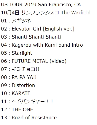 BABYMETAL US TOUR 2019 サンフランシスコ セトリ A鞘師