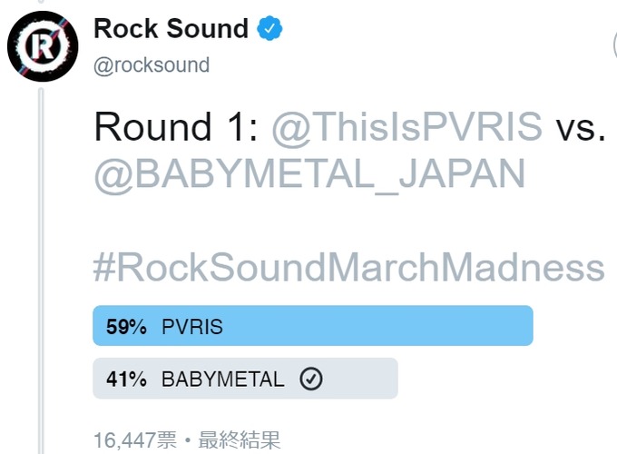 BABYMETAL「Rock Sound March Round 1 ベビメタvsPVRIS 投票結果」