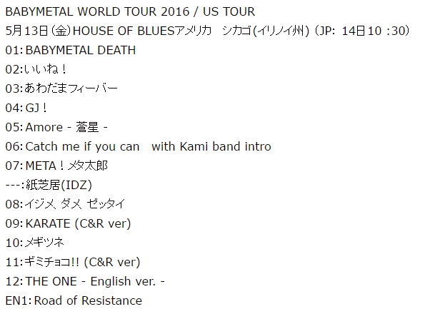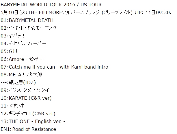 BABYmatoMETAL 全10340件取得 314/345 前の30件 次の30件 2016年5月15日8372 まとめ BABYmatoMETAL BABYMETAL「産経:ベビメタ好きなおっさんよ、立ち上がれ!」 0 0 0 2016年5月15日8358 まとめ BABYmatoMETAL BABYMETAL「米フェスNORTHERN INVASION セトリ」フェスでスニッカーズ煽り 0 0 0 2016年5月15日8352 まとめ BABYmatoMETAL BABYMETAL「米フェスNORTHERN INVASION ステージ前」 0 0 0 2016年5月14日8334 まとめ BABYmatoMETAL BABYMETAL「アミューズ コンサート&音楽パッケージで大幅な増益」 0 0 0 2016年5月14日8307 まとめ BABYmatoMETAL BABYMETAL「US TOUR シカゴ公演 セトリ」今日もギミチョコスニッカーズ 0 0 0 2016年5月14日8293 まとめ BABYmatoMETAL BABYMETAL「US TOUR シカゴ公演 開演前入場開始」 0 0 0 2016年5月14日8278 まとめ BABYmatoMETAL BABYMETAL「フジロック カウントダウン企画・ロッキンジャパンフェス8/6出場」 0 0 0 2016年5月13日8184 まとめ BABYmatoMETAL BABYMETAL「YUIMETALの1人KARATEダンス+BOHスクリーム」 0 0 0 2016年5月12日8170 まとめ BABYmatoMETAL BABYMETAL「Billboard JAPAN ウルトラ・ジャパンでベビメタ再来なるか?」 0 0 0 2016年5月12日8153 まとめ BABYmatoMETAL BABYMETAL「Googleが絵文字追加 ベビメタ風のロッカーも←?」 0 0 0 2016年5月12日8149 まとめ BABYmatoMETAL BABYMETAL「東京ドームチケットTHE ONE 2次当落発表!落選祭り」 0 0 0 2016年5月12日8143 まとめ BABYmatoMETAL BABYMETAL「US TOUR デトロイト公演セトリ」ギミチョコ新煽りギブミーギブミー! 0 0 0 2016年5月12日8136 まとめ BABYmatoMETAL BABYMETAL「US TOUR デトロイト公演 開演前入場開始」 0 0 0 2016年5月12日8116 まとめ BABYmatoMETAL BABYMETAL「ロブ・ゾンビ流のアンチベビメタの黙らせ方」 0 0 0 2016年5月11日8106 まとめ BABYmatoMETAL BABYMETAL「阿部サダヲの十八番はギミチョコ‼︎」 0 0 0 2016年5月11日8090 まとめ BABYmatoMETAL BABYMETAL「US TOUR シルバースプリング セトリ」KARATE フェイク 0 0 0 2016年5月11日8086 まとめ BABYmatoMETAL BABYMETAL「US TOUR シルバースプリング 開演前入場開始」 0 0 0 2016年5月11日8079 まとめ BABYmatoMETAL BABYMETAL「メギツネ中のMOAvsSU-の変顔対決 ついにSU-の変顔が動画に撮られる」 0 0 0 2016年5月10日8067 まとめ BABYmatoMETAL BABYMETAL「ニュース:ロック界の重鎮アリス・クーパーとの4ショットを公開!」 0 0 0 2016年5月10日8042 まとめ BABYmatoMETAL BABYMETAL「BMTHオリヴァーがベビメタTシャツをメンバーに見せる写真」 0 0 0 2016年5月9日8036 まとめ BABYmatoMETAL BABYMETAL「Fuji Rock 20周年 お祝いコメント動画公開」 0 0 0 2016年5月9日8029 まとめ BABYmatoMETAL BABYMETAL「CAROLINA REBELLION 2016ステージ裏写真・Youは何しに日本へ」 0 0 0 2016年5月9日7997 まとめ BABYmatoMETAL BABYMETAL「米フェスCAROLINA REBELLION 2016 セトリ」 0 0 0 2016年5月9日7990 まとめ BABYmatoMETAL BABYMETAL「CAROLINA REBELLION 2016 ステージ前 インタビューを受けるベビメタ」 0 0 0 2016年5月8日7978 まとめ BABYmatoMETAL BABYMETAL「ギミチョコMV再生回数5000万回突破」 0 0 0 2016年5月8日7955 まとめ BABYmatoMETAL BABYMETAL「US TOUR フィラデルフィア公演セトリ」EveryBody JUMP 0 0 0 2016年5月8日7949 まとめ BABYmatoMETAL BABYMETAL「JAPAN COUNTDOWN 歴史的瞬間!音楽の聖地に立つ キャプ集」 0 0 0 2016年5月8日7944 まとめ BABYmatoMETAL BABYMETAL「US TOUR フィラデルフィア公演 開演前入場開始」 0 0 0 2016年5月8日7943 まとめ BABYmatoMETAL BABYMETAL「エンタメNEXT:全米が震撼した理由 その2・ザテレビジョン:ベビメタら“次世代系”注目アイドル」 0 0 0 2016年5月7日7915 まとめ BABYmatoMETAL BABYMETAL「Youは何しに日本へ?次回予告に”BABYMETAL大好きです”」 0 0 0 ホーム BABYmatoMETAL 全10340件 前の30件 次の30件