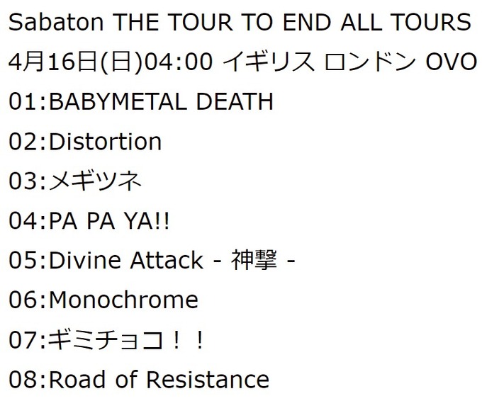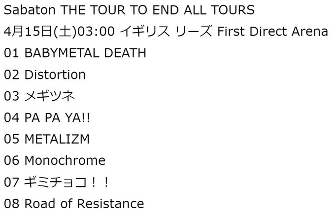 BABYmatoMETAL 全10340件取得 5/345 前の30件 次の30件 2023年4月18日1232253 まとめ BABYmatoMETAL BABYMETAL「ベビメタツイート集」 0 0 0 2023年4月18日1232243 まとめ BABYmatoMETAL BABYMETAL「ベビメタツイート集」 0 0 0 2023年4月17日1232229 まとめ BABYmatoMETAL BABYMETAL Sabaton TOUR イギリス カーディフ公演 セトリ 0 0 0 2023年4月17日1232223 まとめ BABYmatoMETAL BABYMETAL「ベビメタツイート集:MOAMETAL」 0 0 0 2023年4月16日1232217 まとめ BABYmatoMETAL BABYMETAL「おでこ全開の最愛ちゃん!!」 0 0 0 2023年4月16日1232206 まとめ BABYmatoMETAL BABYMETAL「サバトンツアー 英ロンドン セトリ順ファンカム動画」 0 0 0 2023年4月16日1232198 まとめ BABYmatoMETAL BABYMETAL Sabaton TOUR イギリス ロンドン公演 セトリ 0 0 0 2023年4月15日1232187 まとめ BABYmatoMETAL BABYMETAL「Sabaton TOUR 英リーズ セトリ順ファンカム動画」 0 0 0 2023年4月15日1232181 まとめ BABYmatoMETAL BABYMETAL「ベビメタツイート集:トレンド」 0 0 0 2023年4月15日1232177 まとめ BABYmatoMETAL BABYMETAL Sabaton TOUR イギリス リーズ公演 セトリ 0 0 0 2023年4月14日1232156 まとめ BABYmatoMETAL BABYMETAL「THE FIRST TAKE THE ONE - Unfinished ver ツイート集」 0 0 0 2023年4月14日1232140 まとめ BABYmatoMETAL BABYMETAL「THE FIRST TAKE 曲発表 THE ONE - Unfinished ver.」 0 0 0 2023年4月14日1232130 まとめ BABYmatoMETAL BABYMETAL「ベビメタツイート集;ファーストテイク」 0 0 0 2023年4月13日1232124 まとめ BABYmatoMETAL BABYMETAL「ベファーストテイク第二弾は3人で!!」 0 0 0 2023年4月13日1232115 まとめ BABYmatoMETAL BABYMETAL「ベビメタツイート集:最強の販売員」 0 0 0 2023年4月12日1232107 まとめ BABYmatoMETAL BABYMETAL「ベビメタツイート集:最強店員が3人に!!」 0 0 0 2023年4月12日1232101 まとめ BABYmatoMETAL BABYMETAL「ライブ青デロジャケット公開 楽天特典シューレース?」 0 0 0 2023年4月12日1232084 まとめ BABYmatoMETAL BABYMETAL「8月末よりDETHKLOKと北米ツアー」 0 0 0 2023年4月11日1232061 まとめ BABYmatoMETAL BABYMETAL「ベビメタツイート集;ヘドバン」 0 0 0 2023年4月11日1232056 まとめ BABYmatoMETAL BABYMETAL「RollingStoneベビメタ新たな旅のはじまりを目撃」 0 0 0 2023年4月10日1232029 まとめ BABYmatoMETAL BABYMETAL「ベビメタツイート集:台湾公演チケット」 0 0 0 2023年4月9日1232019 まとめ BABYmatoMETAL BABYMETAL「台湾公演チケット1分で完売!!」 0 0 0 2023年4月9日1232016 まとめ BABYmatoMETAL BABYMETAL「サバトンツアーグッズ」 0 0 0 2023年4月8日1231997 まとめ BABYmatoMETAL BABYMETAL「ベビメタツイート集:ミラーミラー」 0 1 0 2023年4月7日1231971 まとめ BABYmatoMETAL BABYMETAL「Mirror Mirror MV公開」 0 0 0 2023年4月7日1231961 まとめ BABYmatoMETAL BABYMETAL「ベビメタツイート集;ヘドバン」 0 0 0 2023年4月6日1231937 まとめ BABYmatoMETAL BABYMETAL「ヘドバン表紙は2人のままだった」 0 0 0 2023年4月5日1231928 まとめ BABYmatoMETAL BABYMETAL「ベビメタツイート集」 0 0 0 2023年4月5日1231924 まとめ BABYmatoMETAL BABYMETAL「ベビメタドローンの神 白石麻衣さん」 0 0 0 2023年4月5日1231915 まとめ BABYmatoMETAL BABYMETAL「Mirror Mirror ライブMV 4/718:00公開」 0 0 0 ホーム BABYmatoMETAL 全10340件 前の30件 次の30件